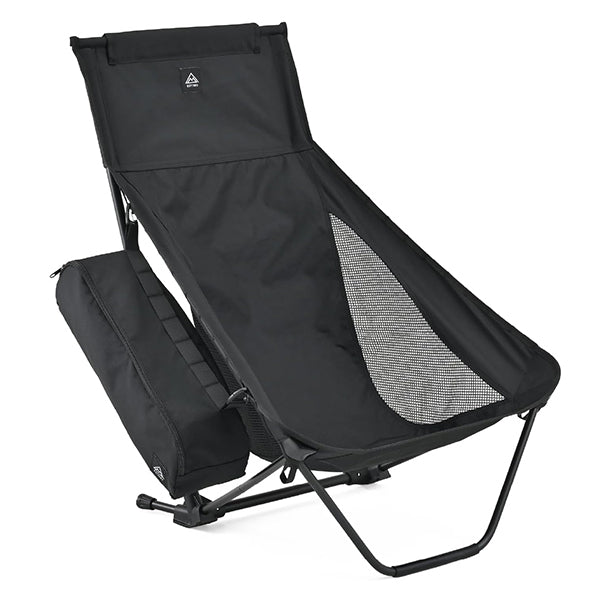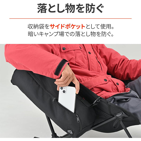 ゆったりくつろぐ、極上のロースタイルチェア。背もたれが高く、頭までしっかり支えてくれる設計で、全身をあずけてリラックスできます。背の低いテント内でも頭が天井にあたりにくく、窮屈さを感じにくいのも特徴です。ロータイプなので、あぐらをかいたり足を伸ばしたり、自由な姿勢で過ごせます。収納袋はサイドポケットとして活用でき、小物を手元に置くことも可能。両サイドにはパルステープが付いているので、風で飛ばされやすい袋などを固定可能です。