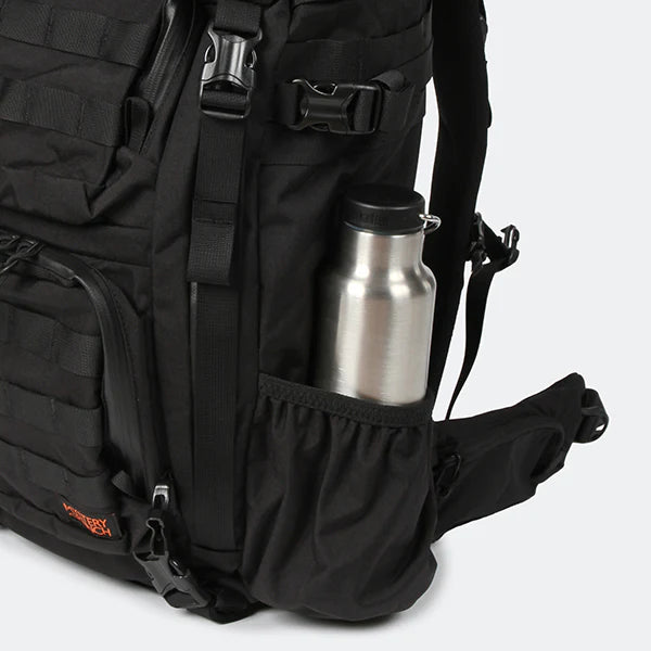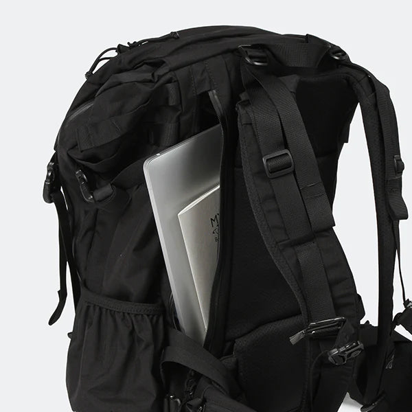 ラップトップPCスリーブはハイドレーションポケットともなり、トップとサイドからのアクセスが可能。ボディパネルのサイドジッパーから、スリーブにダイレクトにアクセスすれば、スムースにPCを取り出すことができます。荷物の詰まったバックパックからさっとPCを取り出して、少しだけワークしたい時には驚くほどに快適なサイドアクセスです。両サイドのボトルポケットにはボトム部分にグロメットで穴が開いているため、ボトルや折り畳み傘など濡れたものを入れた際にも水の抜ける仕様です。サイドコンプレッションはパックの内容量によりタイトにしたり緩めたりすることでパック全体をコンプレッションし、安定して運搬できます。